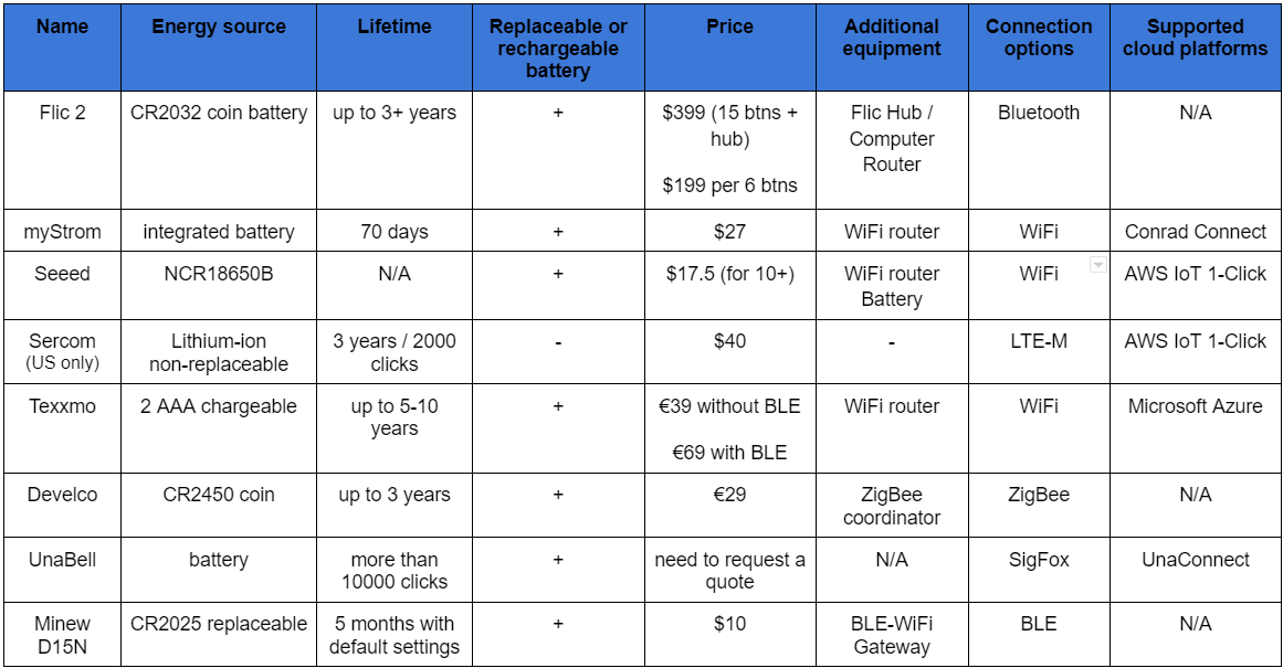 One of the most critical parameters of a button is its power source. Of course, wireless buttons are the best choice because having a tangle of wires is a terrible experience. Obviously, wireless buttons should be battery-powered, so we need to pay attention to the battery’s lifetime when choosing an IoT button.