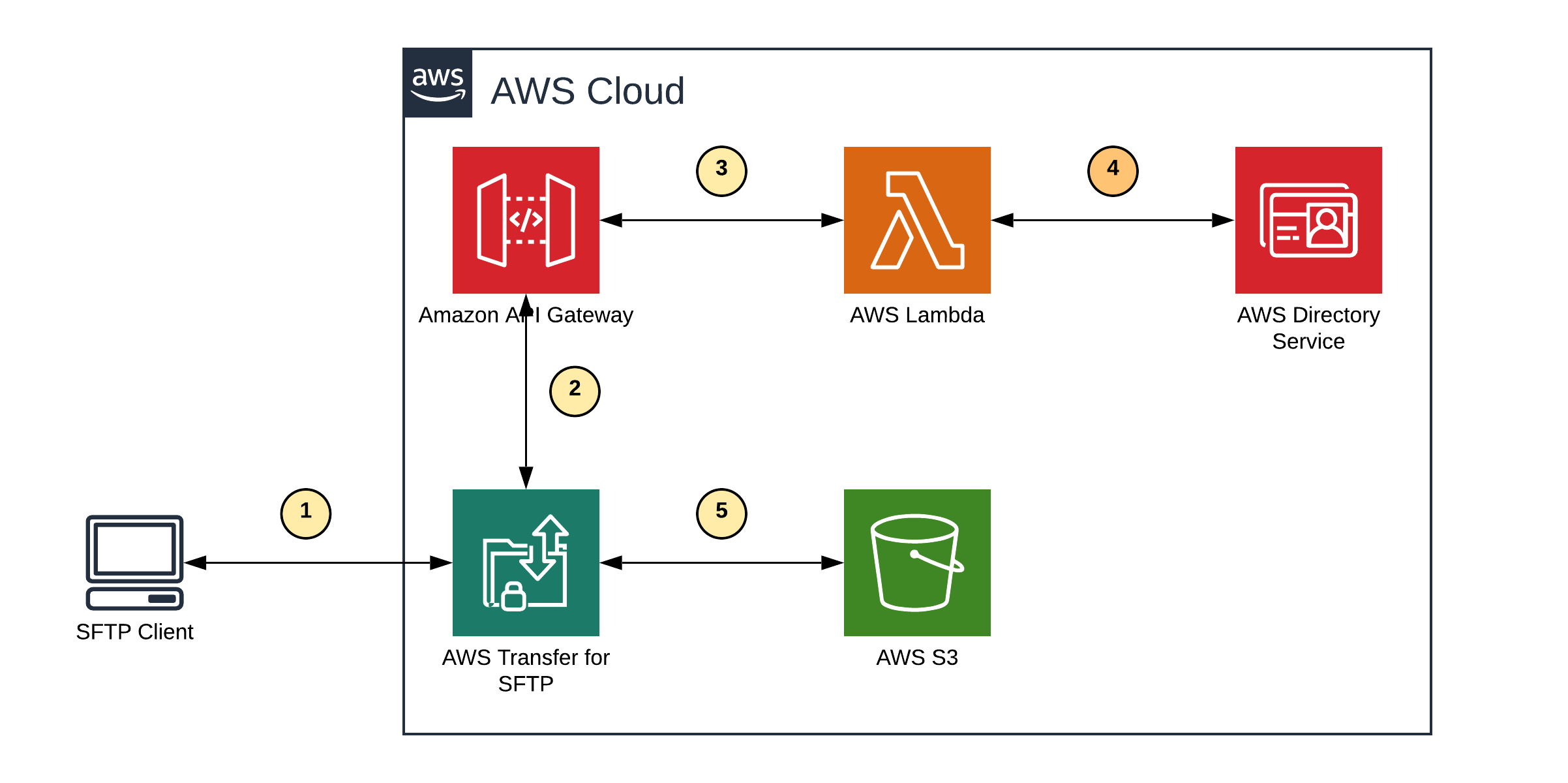 We are going to use AWS Transfer for SFTP with a custom authentication configured to allow uploading files to S3 via SFTP using Active Directory credentials: