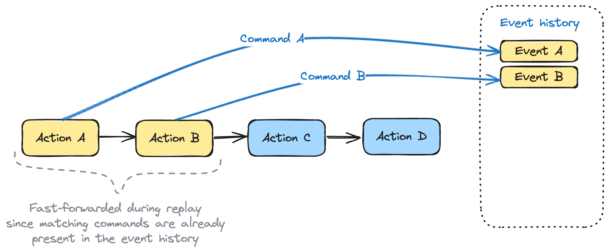 As it’s obvious from it’s name, workflow is a code representation of repeatable set of actions. Workflow code in temporal is called “Workflow definition”. Result of the workflow code is “Workflow execution”. It’s important to understand the durability of Temporal workflow is achieved by the mechanism of replays. It means, if the workflow execution is for some reason stopped (e.g. the server was redeployed), Temporal will attempt to execute the workflow code again. Each temporal API call within the workflow produces a command. This command is compared to the event history of the workflow. Replay happens until the last present event is found in the history.