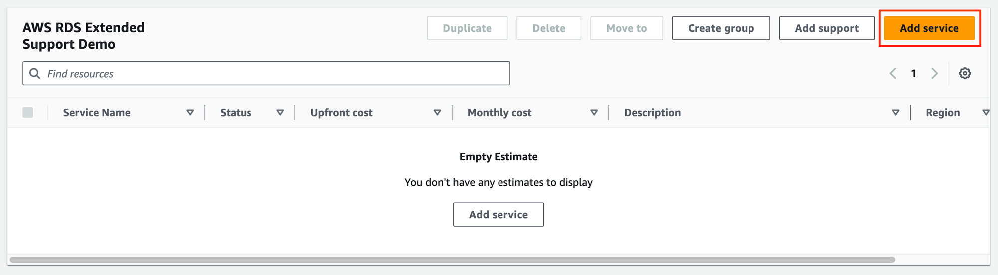 The best way to estimate the cost of Amazon RDS Extended Support is to use the AWS Pricing Calculator. To do so, open the calculator and click the “Add service” button: