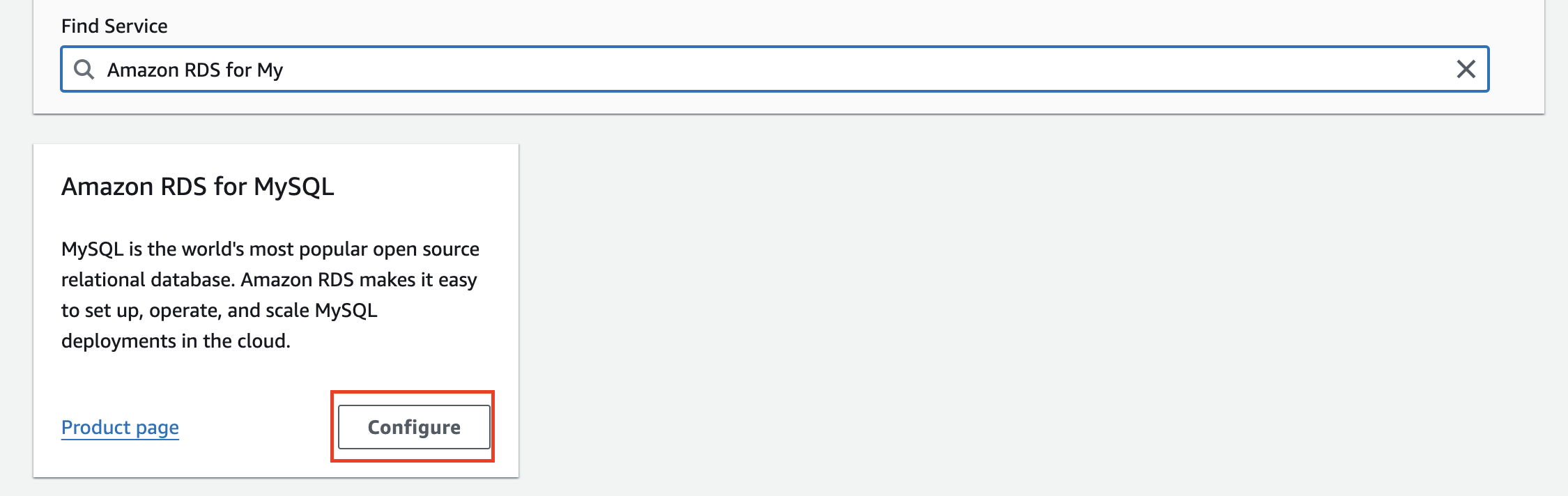 Enter “Amazon RDS” in the search prompt and select the needed product, for example Amazon RDS for MySQL and click “Configure”: